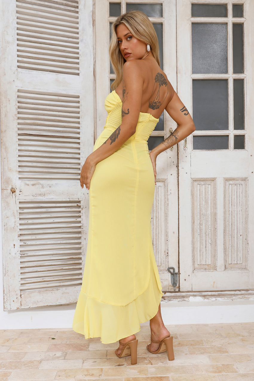 Readytomakeastatement?Choose the Supermodel Moment Strapless Midi Dress.Featuring an elastic back, a twist front with cutouts and an asymmetrical flowy skirt. Style with heels and curls for all the compliments.