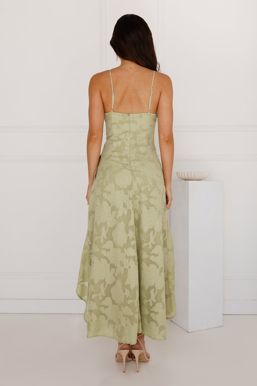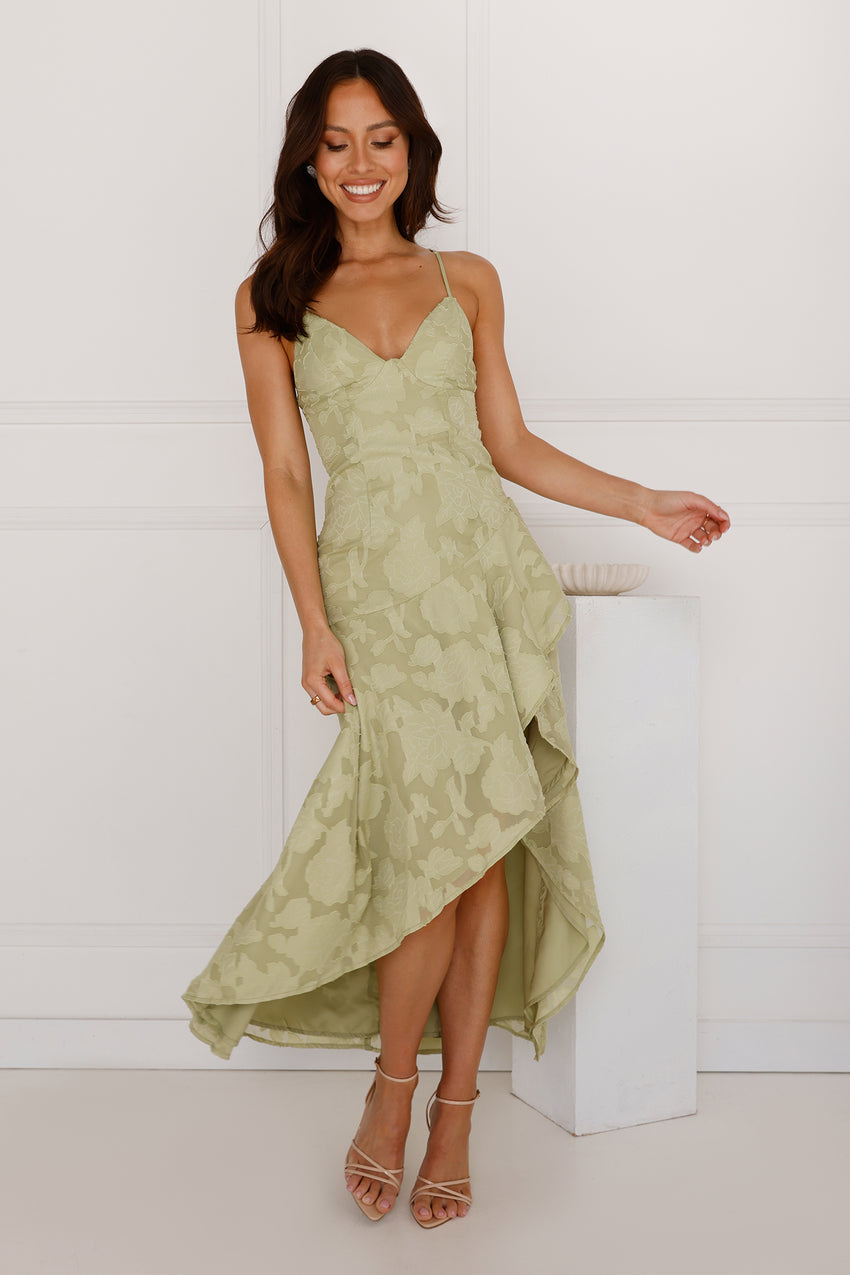 Stylish, timeless and perfect for your next party. The Touch Of Magic Midi Dress features a gorgeous asymmetric frill skirt, a pretty pattern to the fabrication and a dreamy green hue. Style with heels for all the attention.
